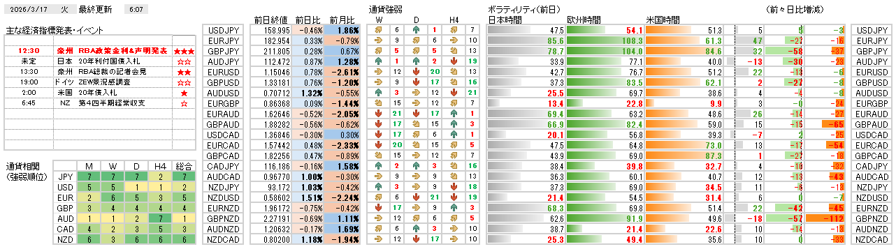 通貨相関からは、マイナー通貨全般に強さが継続しています。USDの相対的な弱さは継続しており、EUR・GBPとともに弱いグループ群に位置しています。JPYは中立的な位置づけですが、比較的堅調な展開になっています。引き続き、メジャー通貨売りのマイナー通貨買いの通貨選択を継続したいと思います。