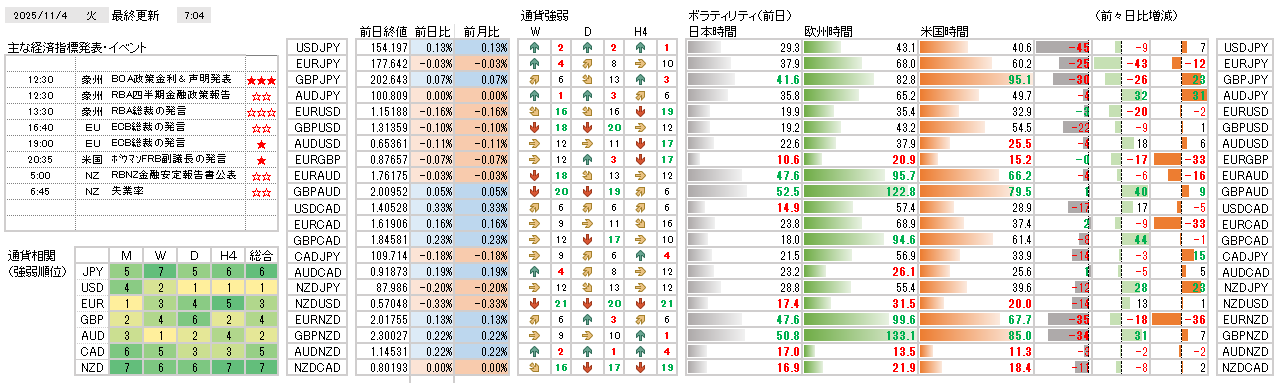 通貨相関からは、下位足でUSDが最弱通貨となりました。USDにつれてCADの弱さも目立っています。AUD・NZDの堅調さが続き、GBPは相対的な強さを確認することができます。JPYは対USDで反発の動きから最弱通貨を脱しました。EURは反落の動きを強めており、メジャー通貨全般に弱い動きになっています。AUD・NZDの強さを背景とした通貨選択をしたいと思います。また、USD安の動きからドルストレート通貨にも注目しています。