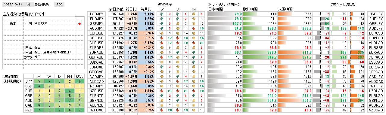 通貨相関からは、NZDの強さが継続し、EUR・GBPが堅調となるなど、前日の動きを踏襲しています。弱さの継続を背景にUSD・CAD・JPYの売りや、EUR・GBPの買いを軸に通貨選択をしたいと思います。