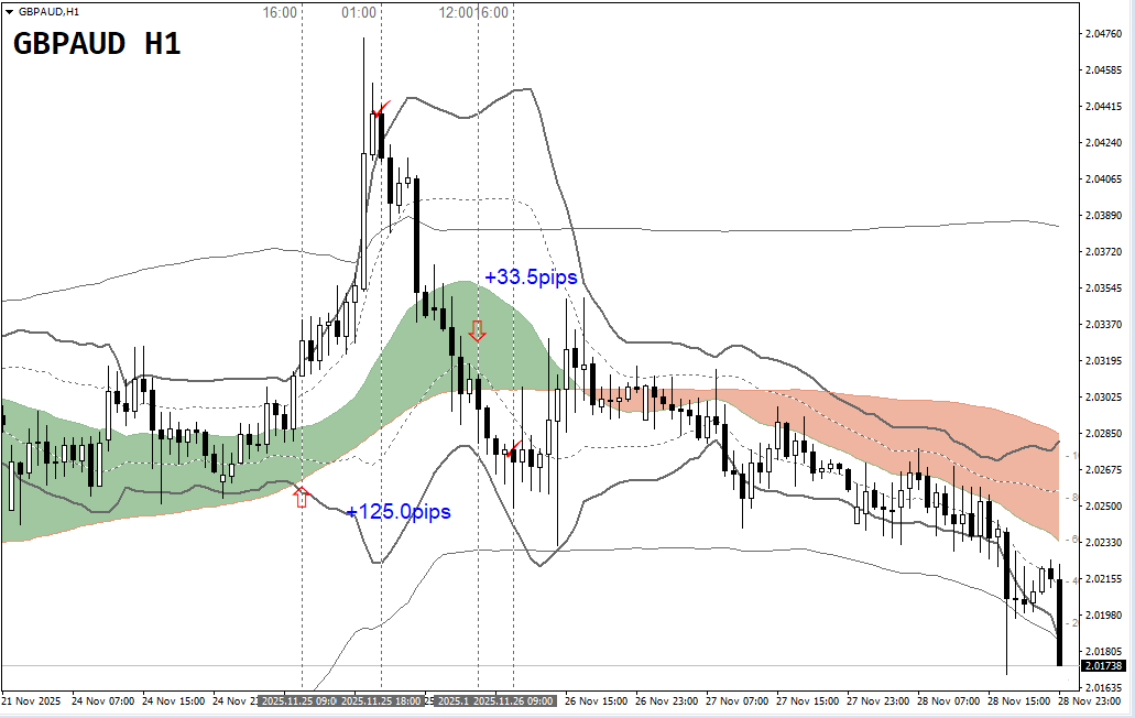 今週は、日米英の金融政策やトランプ関税の影響などから様子見となり、ボラティリティの低い展開となりました。このため、トレードチャンスが少なくなりました。100pipsを超えるトレードがなく、エントリーしても少ない収益で決済する局面がありました。