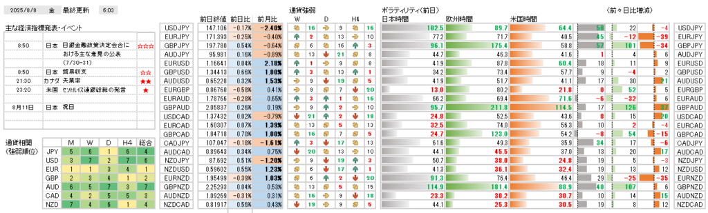 2025年8月8日(金)米相互関税発動の影響は?! 今日の環境分析 2025.08.082025.08.09 日本貿易収支6月:4696億円(予想4088億円、5月-5223億円)カナダ雇用統計7月失業率:6.9%(予想7.0%、6月6.9%) 雇用者数前月比:-4.08万人(予想2.00万人、6月8.31万人)