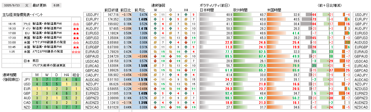 今日の環境分析 2025年9月23日(火)欧米各国のPMIに注目! 昨日は市場全体の方向性が乏しく、ボラティリティが低下し、資金がゴールドに流れた可能性が高いように思われます。現状、通貨相関からはUSDの強さが継続しているものの、レンジ相場からの脱却には時間を要すると... 2025.09.23 今日の環境分析