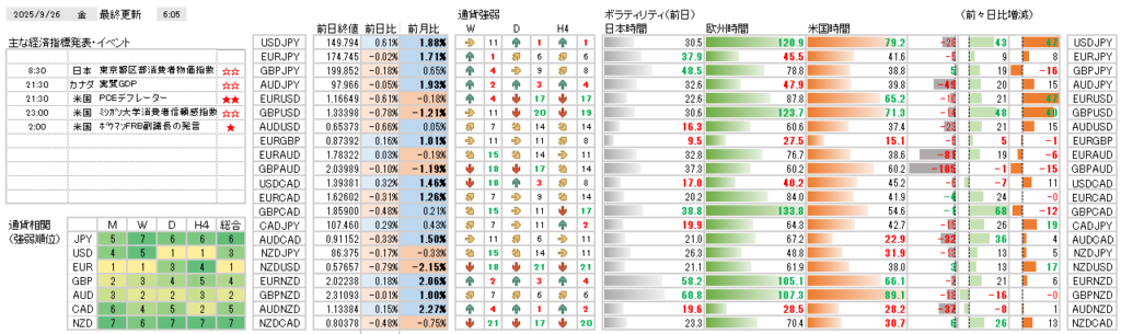 米国GDPの上方修正によって追加利下げの期待が後退し金利が上昇した結果、ドル全面高が続いています。特にUSDJPYは円安ドル高が進んでいますが、これは主にドルの強さによるものであり、JPY、EUR、GBPといった他の通貨が相対的に弱くなっています。本日は、FRBの金融政策に重要な米国のPCEデフレーターが発表されるため、USDの大きな値動きに警戒が促されています。また、スイスフランは中央銀行が為替介入の可能性に言及するほどの高値圏にあり、市場全体への影響についても注意が必要です。