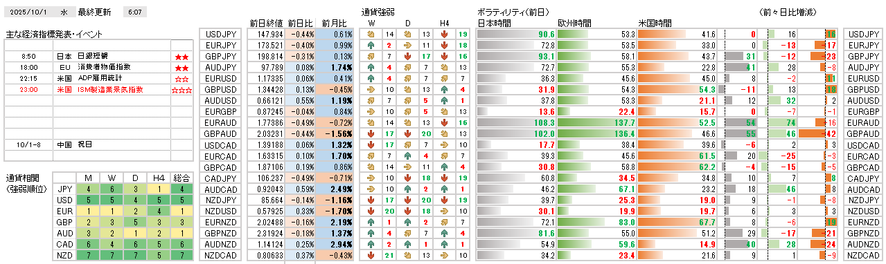 未分類 2025年10月1日(水)期初の動きに警戒!米ISMに注目! 昨日の市場では、米国政府機関の閉鎖懸念の高まりから米ドルの回避の動きが強まり、USDJPYは下落を続けています。米国の労働市場の減速を示すJOLTS求人件数や消費者信頼感の低水準といった経済指標により... 2025.10.01 未分類