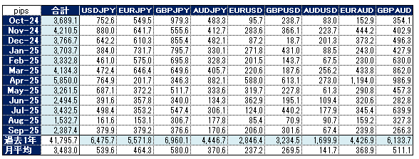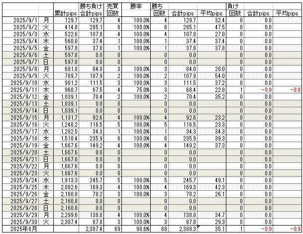 9月のトレード結果は+2,387.4pipsと、8月に次ぐ今年2番目の低水準となりました。