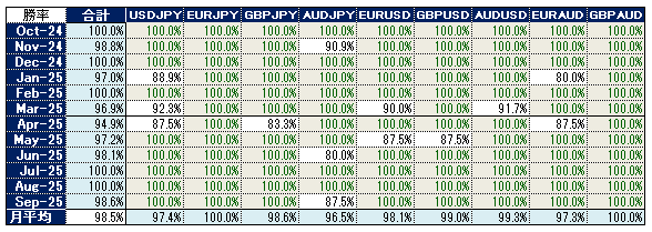 取引回数は9通貨合計で69回と平均並みの水準に戻り、勝率は98.6%でした。