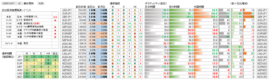 高市氏の自民党総裁決定を受けてクロス円が大幅に上昇し、EURJPYは過去最高値を更新する中、USDJPYの水準が今後の円安の行方を判断する鍵となりそうです。円の弱さが際立つ一方で、米国の政府機関閉鎖の影響や欧州の政局不安により、USDやEURよりもAUDやGBPの優位性が目立つ状況です。本日は、日本の30年国債入札や多数予定されているFRB高官の発言があり、米国の政府閉鎖の早期解決の可能性にも注意しておきたいと思います。