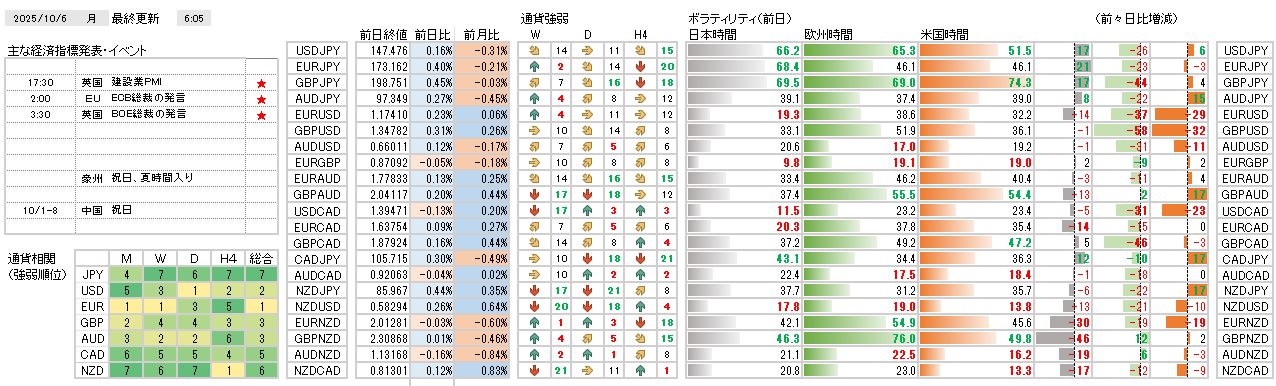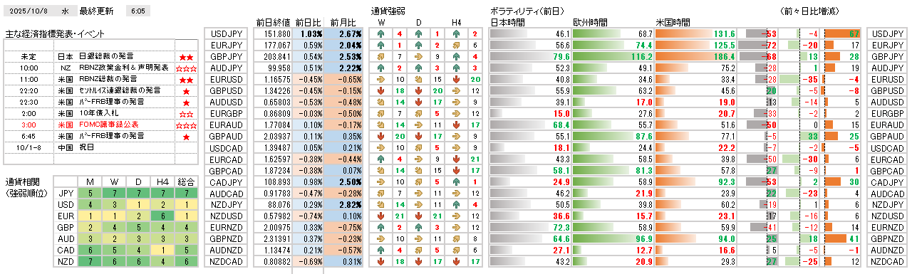 高市氏の自民党総裁決定を受けてクロス円が大幅に上昇し、EURJPYは過去最高値を更新する中、USDJPYの水準が今後の円安の行方を判断する鍵となりそうです。円の弱さが際立つ一方で、米国の政府機関閉鎖の影響や欧州の政局不安により、USDやEURよりもAUDやGBPの優位性が目立つ状況です。本日は、日本の30年国債入札や多数予定されているFRB高官の発言があり、米国の政府閉鎖の早期解決の可能性にも注意しておきたいと思います。