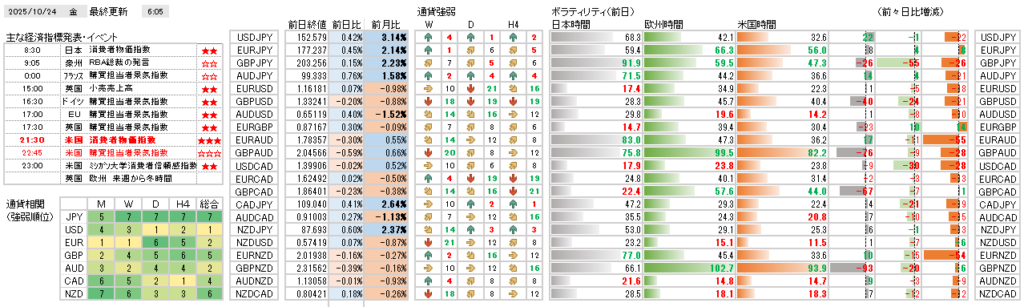 ボラティリティは低いものの、クロス円が上昇し、特にUSDJPYとEURJPYが月初の高値に近づいています。通貨相関ではJPYの弱さが継続し、USDとCADの強さが目立つ一方、AUDも上位足の強弱順位が上がっていることから強いと思われます。本日は日本の消費者物価指数、英国の小売売上高、米国の消費者物価指数など、市場に大きな影響を与える可能性のある重要な経済指標の発表が相次ぐため、特に米国の指標に警戒し、週末にかけて大きな動きが始まる可能性に注意が必要です。
