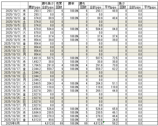 10月のトレード結果は+4,012.8pipsと今年4番目に高い収益水準となりました。8月・9月と低水準でしたが、久しぶりに平均を超える収益を確保することができました。