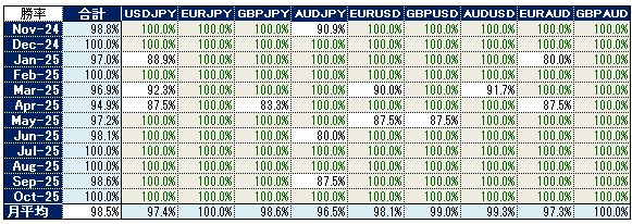 取引回数は9通貨合計で69回と前月と同じ平均水準となり、勝率は100.0%でした。