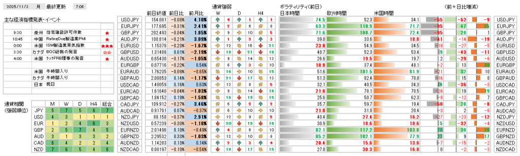 先週末は月末が重なり様子見の展開となり、特にクロス円の上値が重くなりました。通貨相関では、米ドルとカナダドルの強さが続き、特にユーロが最弱通貨と判断できまる一方、日本円(JPY)には達成感が見られます。今週の最大の注目はオーストラリアと英国の金融政策の発表であり、本日は米国のISM製造業景気指数が最大の注目イベントとなります。米国政府機関閉鎖により公的統計が不足しているため、民間統計への感応度が高まっており、ドル高の持続性とUSDJPYの動きに警戒が必要となります。