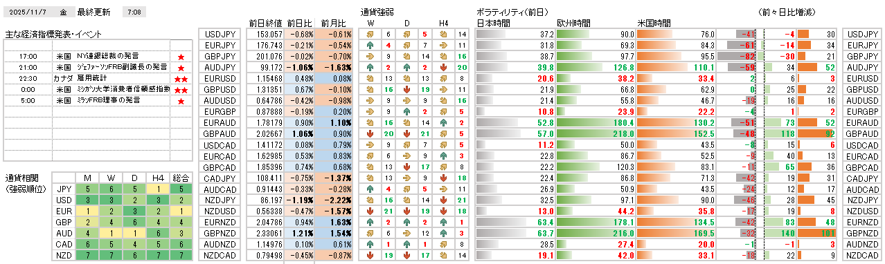 今日の環境分析 2025年11月7日(金)ドル反落の持続性に注意?! 昨日は、通常なら注目度の低いチャレンジャー人員削減数が前年同月比で大幅に増加し、22年ぶりの高水準に達したことが市場に大きな影響を与え、これを受けて債券利回りの低下とドル安が進行しました。この状況は、... 2025.11.07 今日の環境分析