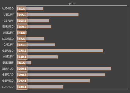 10月のスイングトレードは、+2,145.9pipsの収益、トレード回数は14回、14勝0敗、勝率100%となりました。平均獲得pipsは153.3pips、平均保有日数は5.6日となりました。
