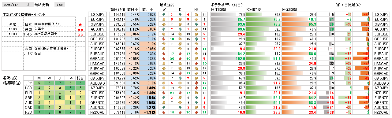 前日は米国の祝日による様子見の展開でボラティリティが低下しました。特に英国の雇用統計が市場予想を下回りGBP安につながり、ドイツのZEW景況感指数も予想を下回りました。また、米国の雇用環境の悪化がADPの週次雇用統計で確認されており、政府機関閉鎖解除後の主要な経済指標発表への期待とともに警戒しています。通貨相関ではAUDとEURの強さが確認されており、EURJPYの動向や、本日の複数のFRB高官の発言がUSDの動きに与える影響に注意したいと思います。