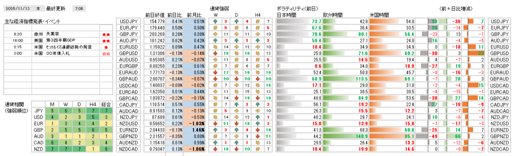 ドル円が155円台に上昇したことや、片山財務相による急激な円安への懸念表明に言及し、日銀の次回会合までの期間は口先介入が強まり、効果がない場合は実際の介入もあり得ることに注意したいと思います。また、米政府機関閉鎖がまもなく解除されるものの、重要な経済統計の発表が見送られる見通しであり、これが12月のFOMCの金融政策判断に大きな影響を与え、民間統計への注目度が高まることになります。通貨相関からは、JPYとGBPの売り、AUDの買いを軸とした通貨選択に注目していますが、円買いへの介入警戒や本日発表の豪州の雇用統計、英国のGDPなどに注意したいと思います。