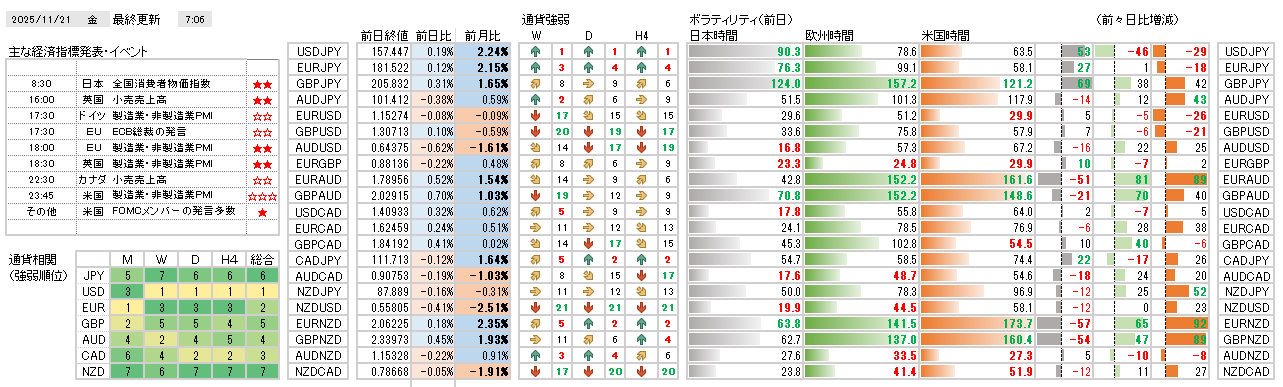 今日の環境分析 2025年11月21日(金)欧米PMIに注目! 米国の9月雇用統計の結果が市場予想を上回ったものの、過去データの修正により労働市場への懸念が強まりました。これがUSDの上値を抑制していると思います。通貨相関ではUSDの強さとJPYの弱さが継続してお... 2025.11.21 今日の環境分析
