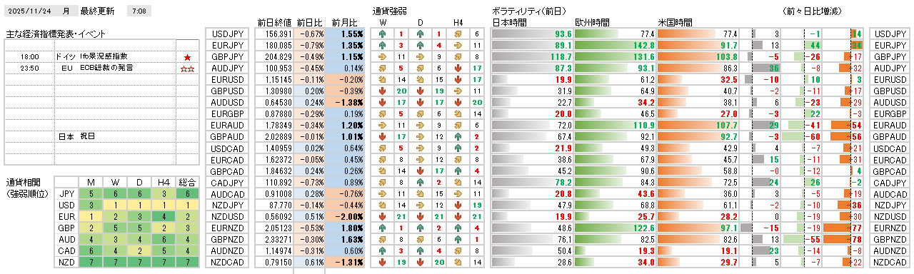 今日の環境分析 2025年11月24日(月)今週は様子見? 週末金曜日は、財務相の介入示唆や日本の投資家によるポジション整理によってドル円が下落し、目先調整がみられました。通貨相関からは、米ドルの強さが継続しているものの、円の強さが回復していることから、ドル円... 2025.11.24 今日の環境分析