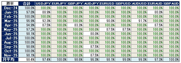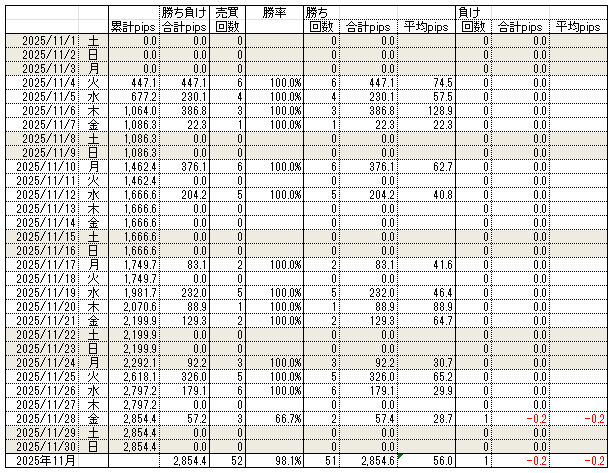 11月のトレード結果は+2,854.4pipsと、前月から大きく減少し平均以下の水準となりました。