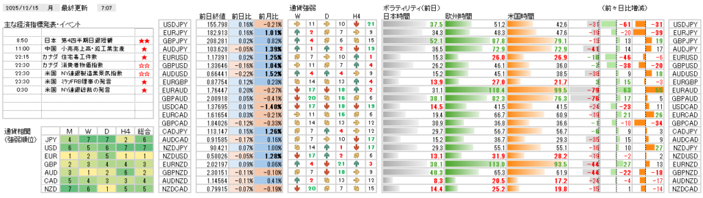 週末は様子見の展開でしたが、EURがGBPに対して堅調であり、これは市場が織り込んでいるBOEの利下げとECBの据え置きという政策金利のコンセンサスを反映したものと思われます。通貨相関からはEURの強さとUSDの弱さが際立ち、JPYも相対的に強くなっています。今週は3つの中央銀行の政策金利発表(BOE利下げ、ECB据え置き、日銀利上げがコンセンサス)のほか、PMIや雇用統計など重要な経済指標が多数予定されており、年末最後の大きなボラティリティが見込まれています。トレーディングの軸として、EUR・JPYの買いとUSD・GBPの売りを軸とした通貨選択を考えています。市場はまだ政策金利の状況を十分に織り込んでいない可能性は高いと考えています。