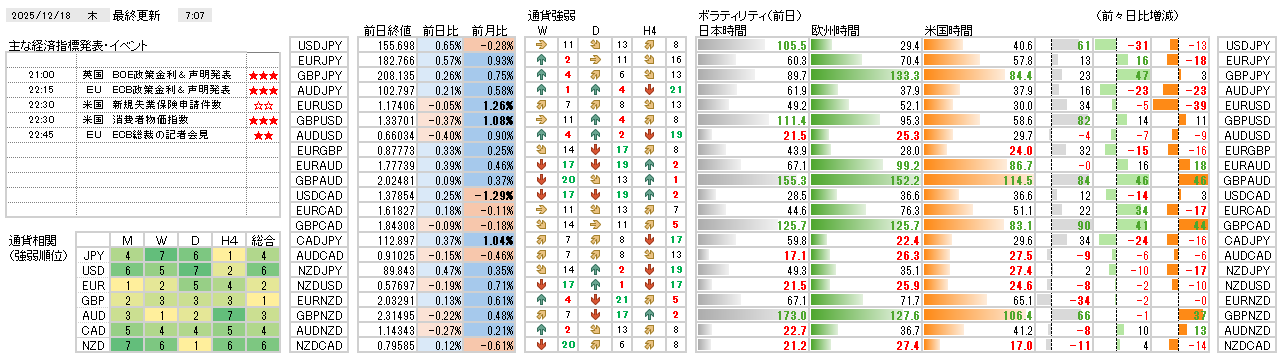 今日の環境分析 2025年12月18日(木)英・EUの金融政策と米CPIに注目! 昨日は、英国CPI発表を受けGBPが変動し、AUDJPYを除くクロス円通貨が反発しました。通貨相関からは、JPYの強さとUSDの顕著な強さ、AUDの継続的な弱さが確認できます。 本日は、英国BOEとユ... 2025.12.18 今日の環境分析