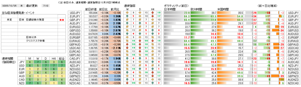 本日は、当欄で利用しているMT4がクリスマス休場に伴い稼働していないため、通常の表記と若干違っています。年中24時間取引が特徴のFX市場ですが、12月25日と1月1日は休場となります。
