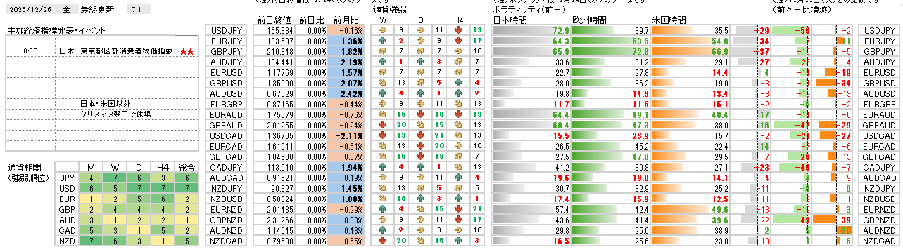 今日の環境分析 2025年12月26日(木)日米以外は金融市場休場に注意! クリスマス休暇に伴う市場の流動性低下に警戒しつつ、日本と米国のみが稼働している特殊な環境下での円とドルの動向を注視しています。特に、実需取引の最終受渡日にあたる日本時間においては、ドル円を中心に予期せ... 2025.12.26 今日の環境分析