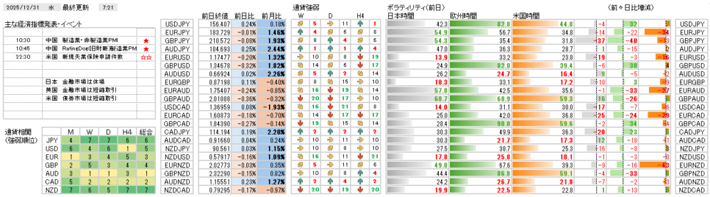 昨日は米ドルの買い戻しが強まり、日本円が弱含みましたが、全体的な通貨の強弱関係は依然として不透明な状況にあります。各通貨ペアのテクニカルな位置関係から、ここからのさらなる円安進行には慎重に見ています。本日は大晦日で、年内最終日となります。日本市場の休場や英米の短縮取引により、市場の流動性が低下し、スプレッドが拡大するリスクに注意したいと思います。本日は無理に取引を行わず、新年の再開に備えておきたいと思います。