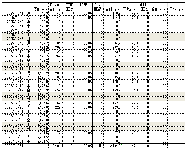 12月のトレード結果は+2,404.5pipsと、11月と同様に平均以下の水準となりました。