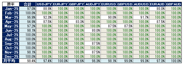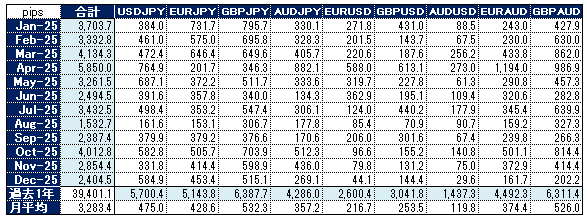- JPY関連通貨:USDJPY・GBPJPY・EURJPY・AUDJPYの順に月間の収益上位を独占しました。