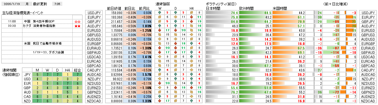 今日の環境分析 2026年1月19日(月)今週は要人発言に注意! 週末の動きを引き継いで円高・ドル高の傾向が強まっており、円とドルの買い、および欧州通貨の売りを軸に通貨選択をしたいと思います。本日は高市首相による衆院解散表明が予定されており、その発言が相場を大きく動... 2026.01.19 今日の環境分析