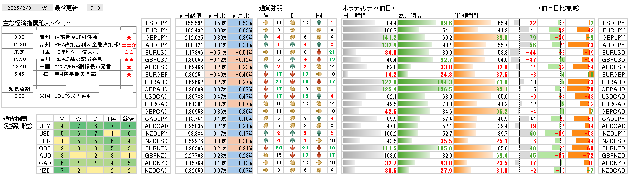 今日の環境分析 2026年2月3日(火)豪政策金利に注目! 昨日は、米国の製造業景気指数が予想外の好調を示したことで、連邦準備制度による追加利下げの可能性が後退し、ドルの独歩高が強まる結果となりました。一方で、米国政府機関の閉鎖により雇用関連指標の発表が延期さ... 2026.02.03 今日の環境分析