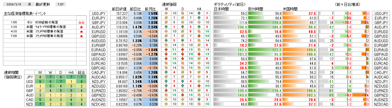 今日の環境分析 2026年2月9日自民党歴史的大勝を受けた円の動きに注目! 週明けのオセアニア市場では、選挙結果を受けてドル円が強く始まったものの、介入への警戒感からさらなる円安の進行には限界があると考えています。通貨相関からは、豪ドルの強さとポンドの弱さに注目しています。ま... 2026.02.09 今日の環境分析
