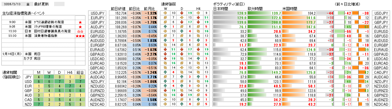 今日の環境分析 2026年2月13日(金)米消費者物価指数に警戒! 直近の米国の雇用関連データが市場に落ち着きをもたらす中、円の強さが継続しているため、円買いを軸とした通貨選択を検討しています。一方で、本日は米国の消費者物価指数(CPI)の発表を控えているため、結果次... 2026.02.13 今日の環境分析