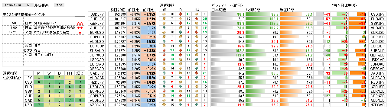 今日の環境分析 2026年2月16日(月)円買いの継続性に注目! 米国消費者物価指数の結果を受けたドル円の軟化や、円の独歩高というのが現状の通貨相関から確認できます。多くのクロス円通貨ペアが保ち合いの状態にあるため、エクスパンションの発生を注視しています。本日は、日... 2026.02.16 今日の環境分析