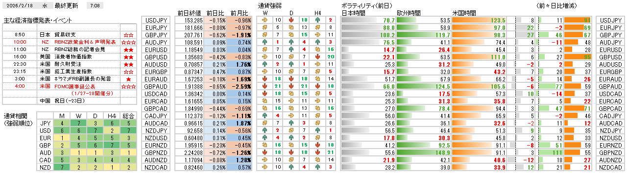 今日の環境分析 2026年2月19日(木)USD買いの持続性に注目! オーストラリア雇用統計1月失業率:予想4.2%(12月4.1%) 雇用者数:予想2.10万人(12月6.52万人)米国貿易収支12月:予想-555億ドル(-568億ドル)米国新規... 2026.02.19 今日の環境分析
