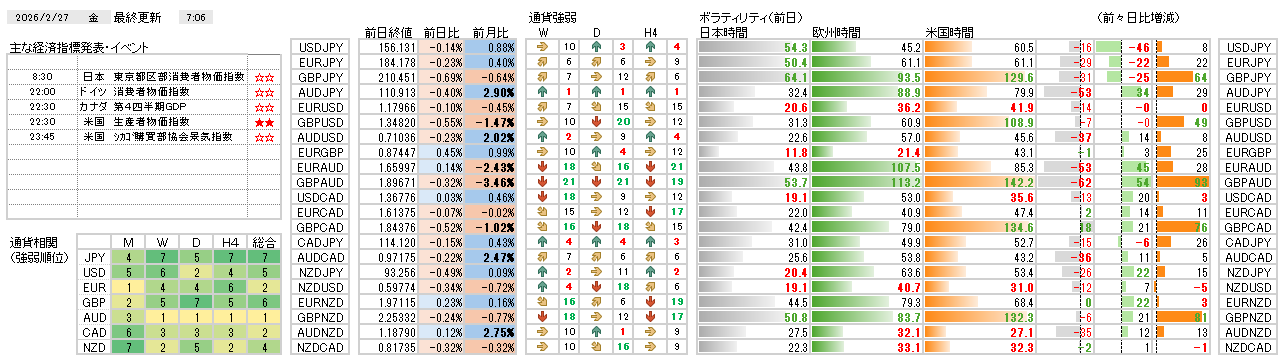 今日の環境分析 2026年2月27日(金)方向感つかみにくく様子見? 前日までのトレンドが失速し、多くの通貨ペアで方向感のない保ち合い状態へ移行しました。通貨強弱においては円の弱さと豪ドルの強さが目立つものの、市場全体では明確な優劣がつけにくい状況にあります。本日は、日... 2026.02.27 今日の環境分析