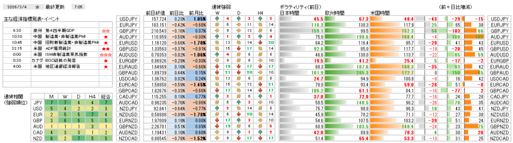 中東情勢の悪化が世界経済に及ぼす影響を背景に、市場の不透明感が強まっています。為替市場では米ドルの強さが際立つ一方、欧州通貨の弱含みが続いており、ドル買いを主軸に据えた通貨選択を検討しています。一方で、市場全体の不透明感から大きなトレンドを望まず、早期の利益確定をしていきたいと思います。本日は、米国のADP雇用者数やISM非製造業景気指数、さらにオーストラリアのGDPが各通貨の勢力図にどのような変化をもたらすかが注目です。