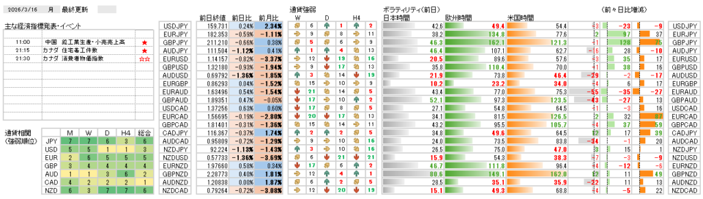 中東情勢の緊迫化やトランプ大統領の動向を受け、米ドルが独歩高となっています。ドル円は節目となる160円を視野に入れていますが、他通貨に対しては日本円も強含みを見せており、逆に対照的な豪ドルの弱さが際立つ展開です。今週は主要国による政策金利の発表が集中するため、各国の中央銀行が地政学リスクにどう反応するかが焦点となります。通貨相関からは、米ドルや日本円の買いと豪ドルの売りを軸にした通貨選択を検討しています。明日以降の各国の金融政策の発表を前に市場は神経質な動きが想定されますが、引き続き原油価格の変動にも警戒しておく必要が高い状況にあります。