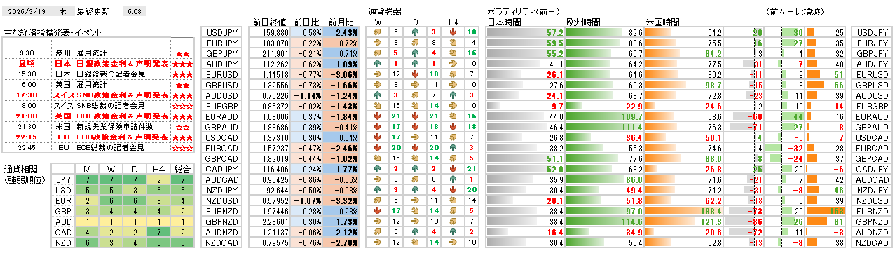 今日の環境分析 2026年3月19日(木)日本・英国・EU・スイスの金融政策に警戒! FOMCが金利据え置きを決定し、景気の不透明感から利下げに慎重な姿勢を示したことで、市場ではドル高が進行し円安圧力が高まっています。本日は、日本や欧州など主要中央銀行の政策金利の発表が相次いで予定され... 2026.03.19 今日の環境分析