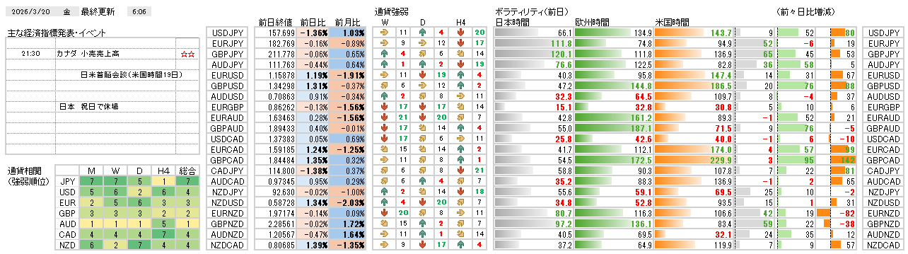 今日の環境分析 2026年3月20日(金)ボラティリティの高まりに警戒! 各国の中央銀行による政策金利発表を経て、市場では材料が出尽くしたことによるトレンドの反転やボラティリティが急上昇しました。特に日銀総裁のタカ派的な発言や年度末の資金還流の影響で円高が進行し、一方で米ド... 2026.03.20 今日の環境分析