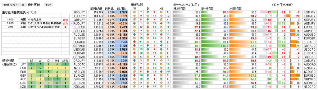 中東情勢への過敏な反応が続くなか、相場は「ドル一強」の状態です。一時的な反落もありましたがドルの底堅さは強く、強弱の明確なUSD買い・AUD売りを軸に通貨選択をしたいと思います。USDJPYは160円目前ですが、介入警戒よりもドル買い主導の動きを優先し、突発的なニュースに警戒していきたいと思います。