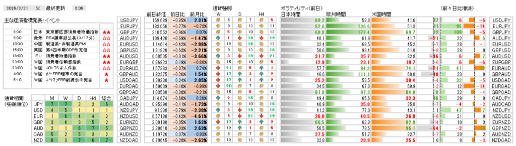 昨日はUSDJPYが160円台に乗せたことを受け、三村財務官による「断固たる措置」という強い表現を用いた円安牽制(口先介入)が行われました。これにより一時159円台前半まで円高が進みましたが、ドルの根強い強さから下値は限定的なものとなっています。本日は年度末・四半期末という極めて重要な節目になります。実需の動きとして、日本企業の3月決算が集中するため、仲値(日本時間10時)に向けたUSDJPYの決算レートを意識した動きに警戒が必要です。通貨相関からは、USDとJPYの買い、AUDとGBPの売りを軸とした通貨選択が有効と考えます。