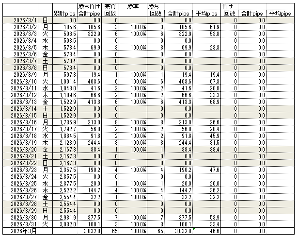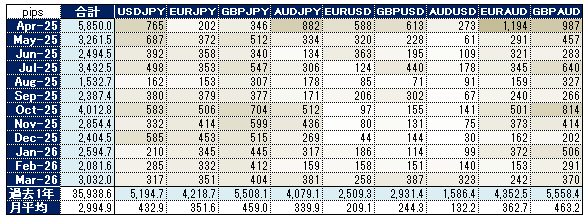 3月のトレード結果は+3,032.0pipsと、平均並みの水準となりました。第2週は火曜日と金曜日に400pipsを超える収益となり、週間収益は昨年12月第3週以来の高水準となりました。このため、月後半は無理なトレードを避け、慎重なスタンスで臨みました。22営業日中、3営業日でトレードを見送りました。平均獲得pipsは46.6pipsとなりました。