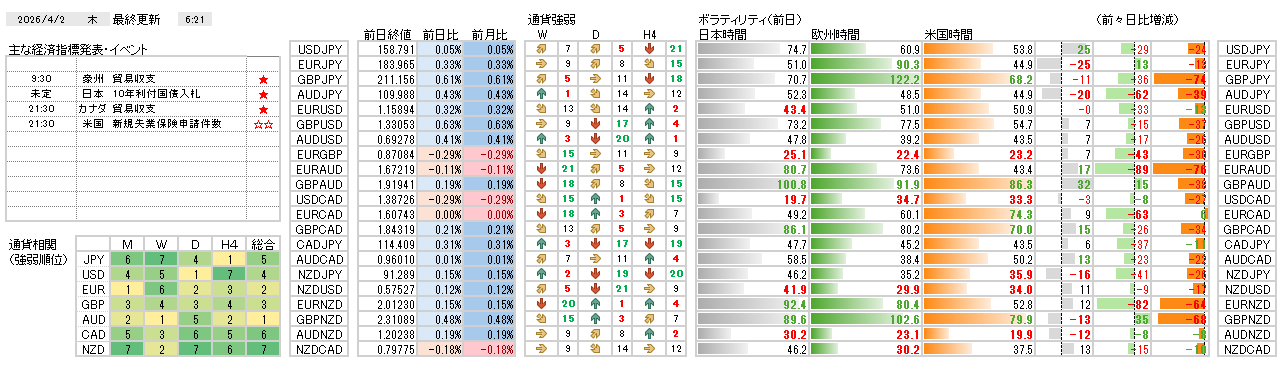 今日の環境分析 2026年4月2日(木)トランプ大統領会見に注目! 昨日は、好調な米国指標とは裏腹に、世界的な景気後退への懸念から市場のボラティリティが低下し、方向感の乏しい展開となりました。通貨相関からは、円と豪ドルの強さが目立つ一方で米ドルの弱さが際立っているもの... 2026.04.02 今日の環境分析