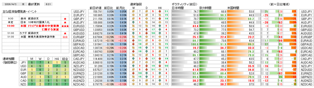 昨日は、好調な米国指標とは裏腹に、世界的な景気後退への懸念から市場のボラティリティが低下し、方向感の乏しい展開となりました。通貨相関からは、円と豪ドルの強さが目立つ一方で米ドルの弱さが際立っているものの、特定の通貨ではなく、個別の通貨ペアの動きを見極める局面です。本日は、トランプ大統領による中東情勢に関する会見があり、その内容が相場を大きく動かす要因として警戒しています。また、明日からのイースター休暇に伴う流動性の低下や、短期的な急変動にも注意を払うべき状況です。
