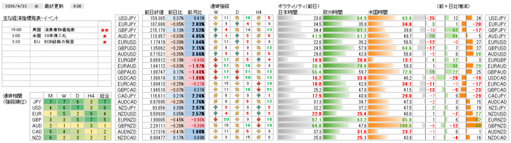 市場は、全体的に方向感に欠ける展開にあります。主要な経済指標の発表や中東の停戦期限延長といったニュースがあったものの、市場の反応は限定的であり、ボラティリティも依然として低いままです。通貨の強弱については判断が難しい局面ですが、今後の米ドル(USD)の動きが明確化するタイミングを待ちたいと思います。また、豪ドル(AUD)の動向や円グループに注意をしたいと思います。不透明な中東情勢よりも世界経済への悪影響への懸念がドルの強さを支える要因になると考えます。